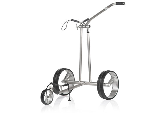 Wie ein Phantom gleitet dieser JuCad Titan-Elektrocaddy auf seinen unvergleichlichen Design-Felgen über das Fairway. Die eleganten Einspeichenfelgen aus Vollcarbon des JuCad Phantom Titan eX 2.0 sind schon eine Sensation für sich. Mit diesen Felgen und dem schlanken Titanrahmen, hervorgehoben durch die bekannte Einarmschwinge am Vorderrad und der eleganten Griffstange mit stufenlosem Geschwindigkeitsregler, wirkt der Caddy wie eine schwebende Erscheinung. Das intelligente Technikpaket sorgt für optimalen Komfort und beinhaltet leise Brushless Motoren mit einer beidseitigen Parkbremse für sicheren Halt auf steilstem Gelände sowie Magnetstecker und eine integrierte Ladestandsanzeige. Dank seiner komfortablen Falttechnik wird der Caddy in Sekundenschnelle auf ein superflaches Packmaß gebracht und verstaut. Höchsten Fahrkomfort bieten der hochfeste Titanrahmen, das kraftvolle und leise 48V Antriebssystem mit den Funktionen Vorwärts, Rückwärts, Neutral und automatischer Vorlauf sowie die Fernsteuerung. Ein besonderes Highlight ist auch das JuCad Powerlock-System, das gleichzeitig die Fixierung der oberen Baghalterung sowie der Griffstange ermöglicht. Der JuCad Phantom Titan eX 2.0 wird inklusive einer praktischen Tragetasche mit separatem Räderbeutel und der bewährten JuCad Fernsteuerung geliefert. JuCad Phantom Titan eX 2.0